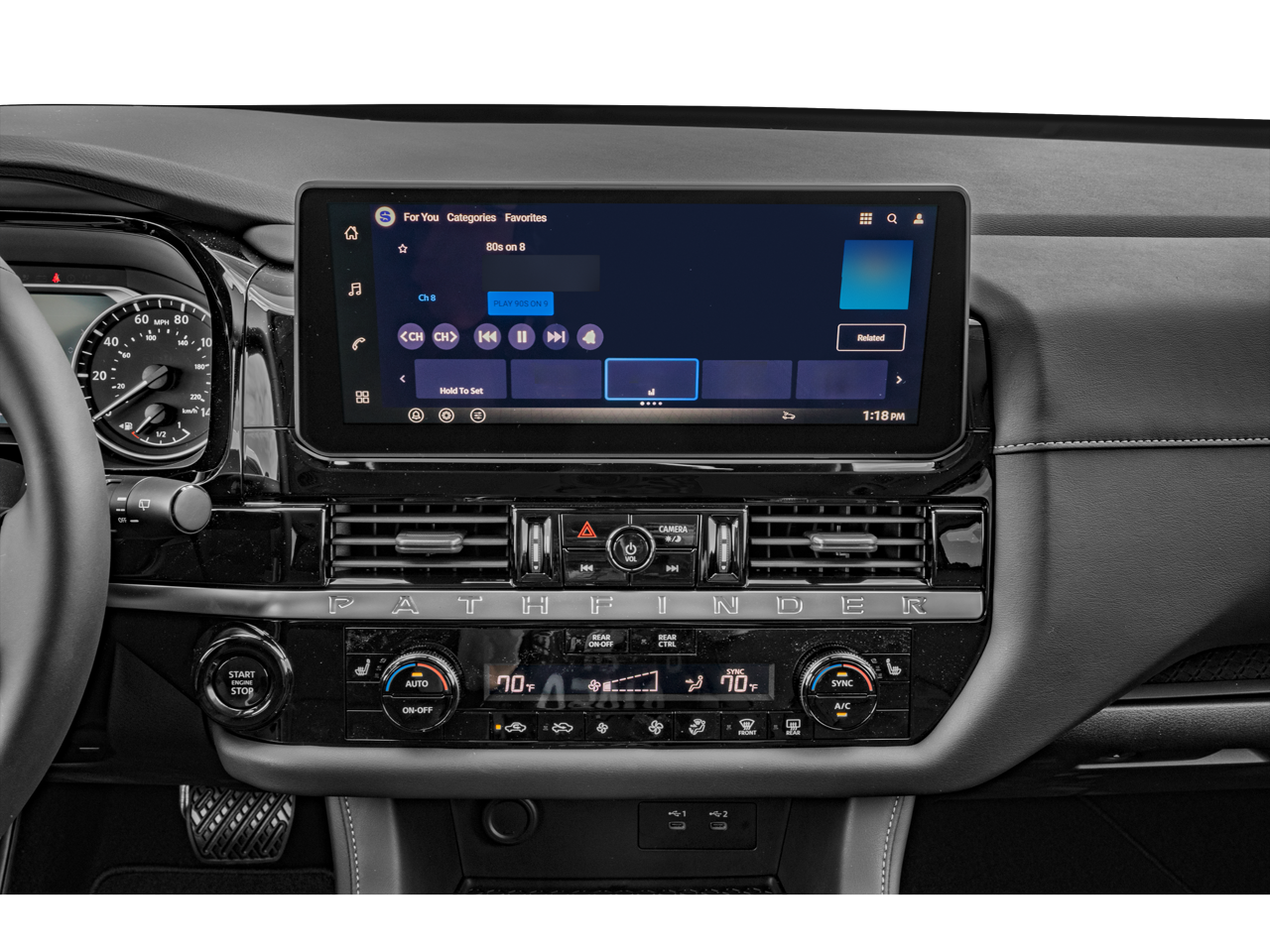 - Radio: AM/FM Audio System w/NissanConnect -inc: 6 speakers, 5G Wi-Fi hotspot, wireless Apple CarPlay and Android Auto, 12.3" center touch-screen display, SiriusXM satellite radio, 2 front USB connection (1 type C charge and data ports), Bluetooth® hands-free phone system, streaming audio and messaging and hands-free text messaging assistant