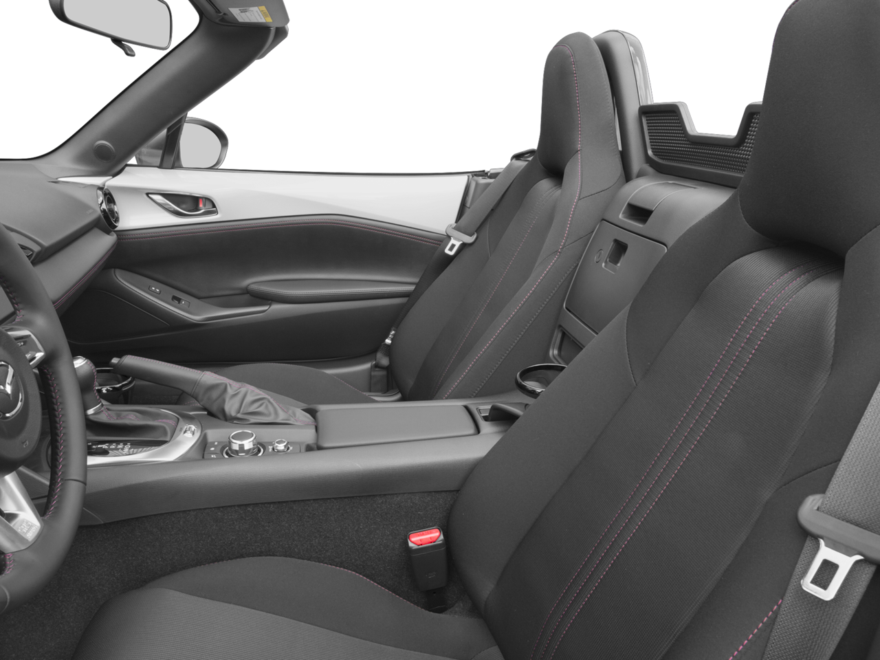 Inside, the Miata Club typically features black cloth seats with red stitching that complement the exterior gray, giving the cabin a sporty but tasteful look. The cockpit remains driver-focused with a compact layout, easy-to-reach controls, and a MAZDA CONNECT infotainment system with a 7-inch touchscreen and a Bose 9-speaker audio system for a surprisingly rich sound experience in such a small roadster.