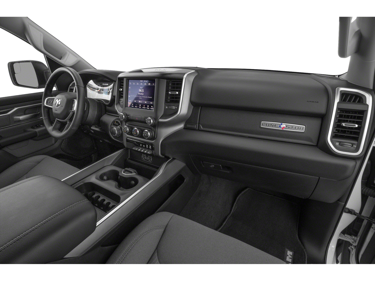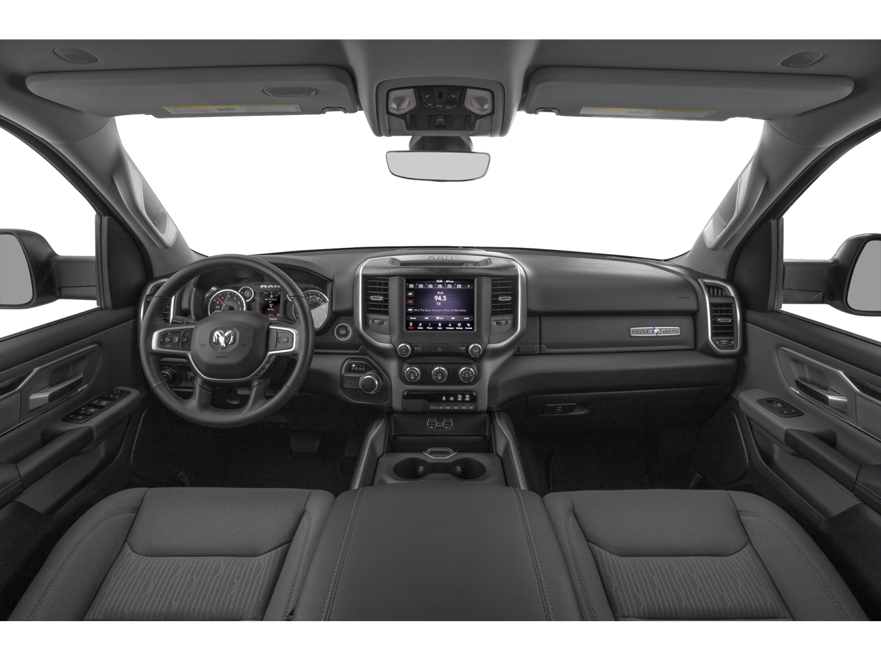 3 Rear Seat Head Restraints, 3.21 Rear Axle Ratio, 4 Way Front Headrests, 4-Wheel Disc Brakes, 48V Belt Starter Generator, 6 Speakers, ABS brakes, Air Conditioning, Alloy wheels, AM/FM radio, Auto-Dimming Rear-View Mirror, Big Horn IP Badge, Big Horn Level 1 Equipment Group, Brake assist, Bumpers: chrome, Class IV Receiver Hitch, Cloth Bench Seat, Cluster 3.5 TFT Color Display, Compass, Delay-off headlights, Driver door bin, Dual front impact airbags, Dual front side impact airbags, Electronic Stability Control, Exterior Mirrors w/Supplemental Signals, Foam Bottle Insert (Door Trim Panel), Front anti-roll bar, Front Center Armrest w/Storage, Front fog lights, Front reading lights, Front Seat Back Map Pockets, Front wheel independent suspension, Fully automatic headlights, Glove Box Lamp, GPS Antenna Input, Heated door mirrors, Illuminated entry, Leather steering wheel, Low tire pressure warning, Manufacturer's Statement of Origin, Occupant sensing airbag, Outside temperature display, Overhead airbag, Overhead console, Panic alarm, ParkSense Front/Rear Park Assist w/Stop, ParkView Rear Back-Up Camera, Passenger door bin, Passenger vanity mirror, Power 4-Way Driver Lumbar Adjust, Power 8-Way Driver Seat, Power Adjustable Pedals, Power door mirrors, Power Heated Fold Away Mirrors, Power steering, Power windows, Quick Order Package 27Z Big Horn/Lone Star, Radio data system, Radio: Uconnect 3 w/5 Display, Radio: Uconnect 4 w/8.4 Display, Rear 60/40 Folding Seat, Rear anti-roll bar, Rear Dome w/On/Off Switch Lamp, Rear Power Sliding Window, Rear seat center armrest, Rear step bumper, Rear Underseat Compartment Storage, Rear Window Defroster, Remote keyless entry, Remote Start System, Single Disc Remote CD Player, SiriusXM Satellite Radio, Speed control, Split folding rear seat, Steering Wheel Mounted Audio Controls, Sun Visors w/Illuminated Vanity Mirrors, Tachometer, Telescoping steering wheel, Tilt steering wheel, Traction control, Trip computer, Universal Garage Door Opener, Variably intermittent wipers, Voltmeter, Wheels: 18 x 8, Wheels: 20 x 9 Aluminum Chrome Clad.