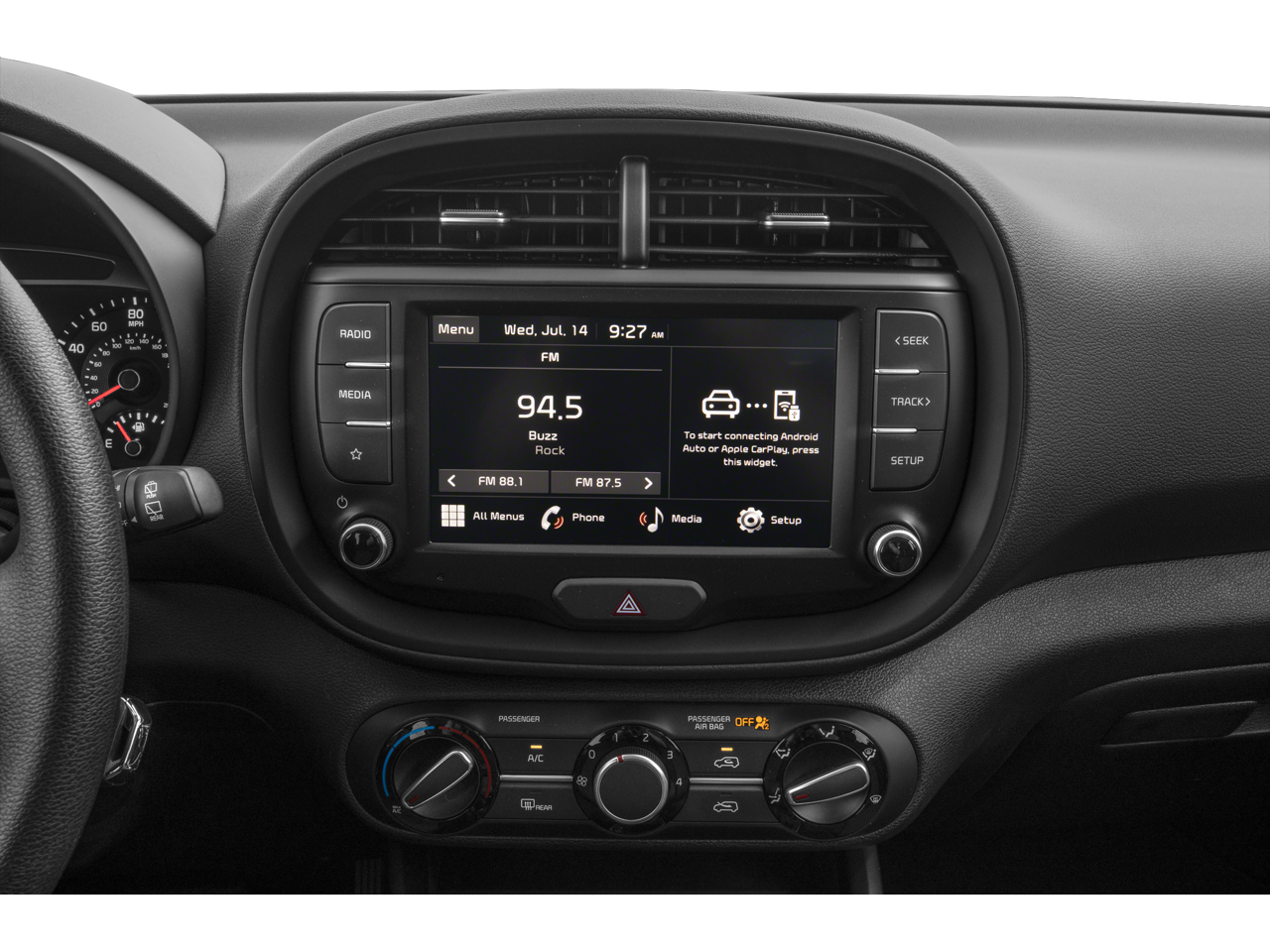 - Radio: AM/FM/MP3 Audio System -inc: UVO link, navigation, HD Radio, SiriusXM, 10.25" color touch screen, 6 speakers, support for Android Auto and Apple CarPlay, USB input, audio remote control, Bluetooth® hands-free w/voice recognition and black shark fine type antenna